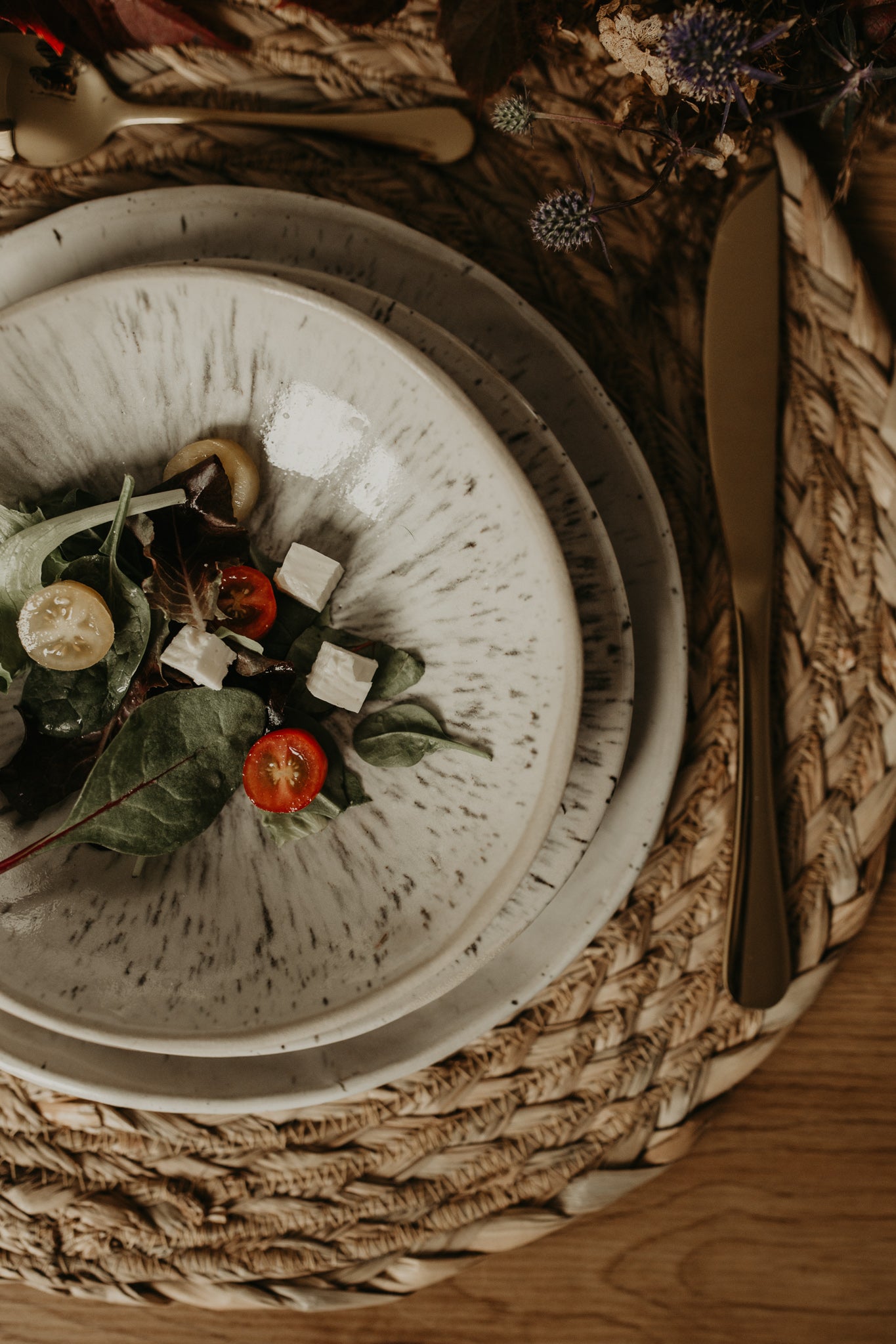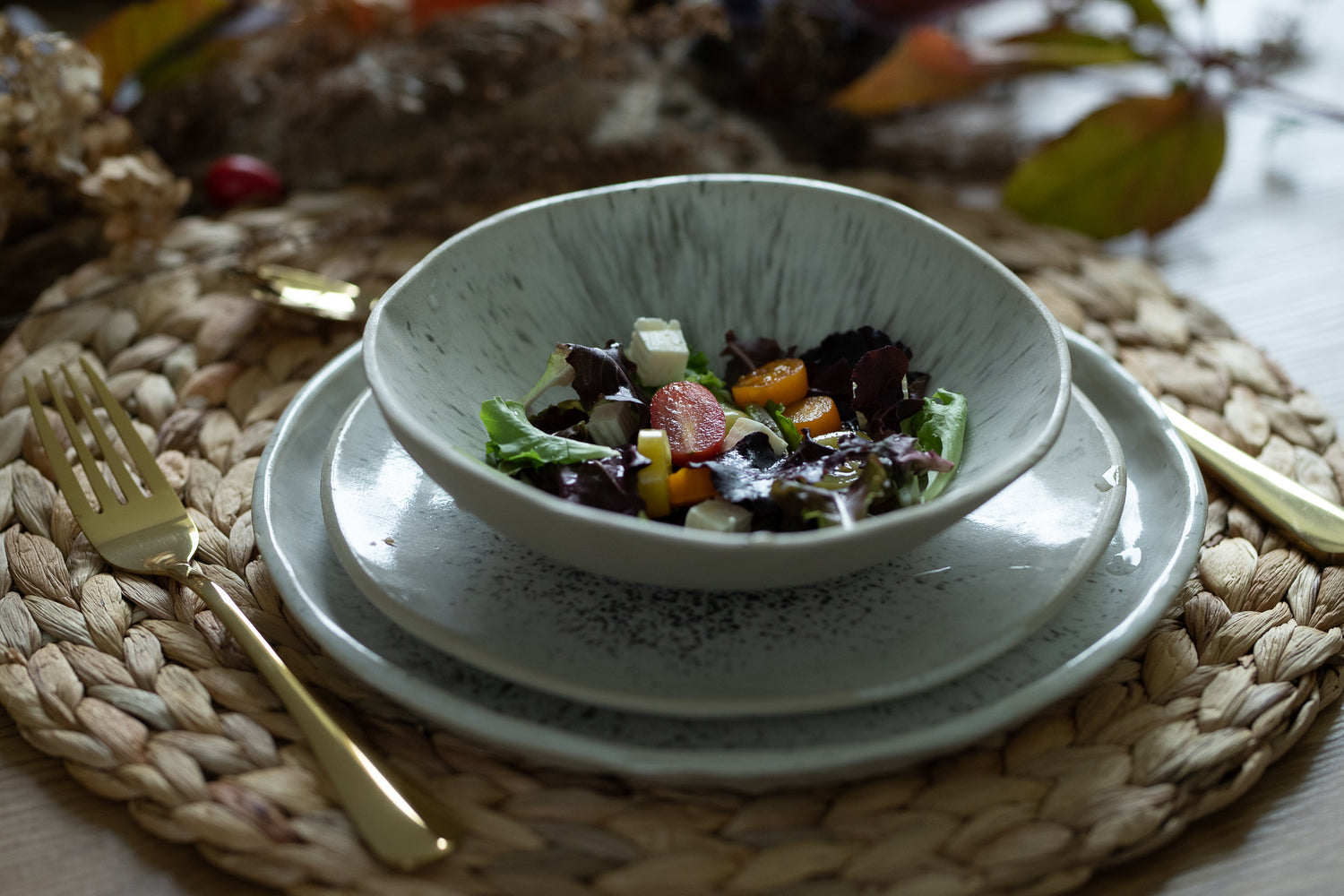 Liela, ar rokām darināta keramikas salātu bļoda – Balta ar raibumiem (17 cm)