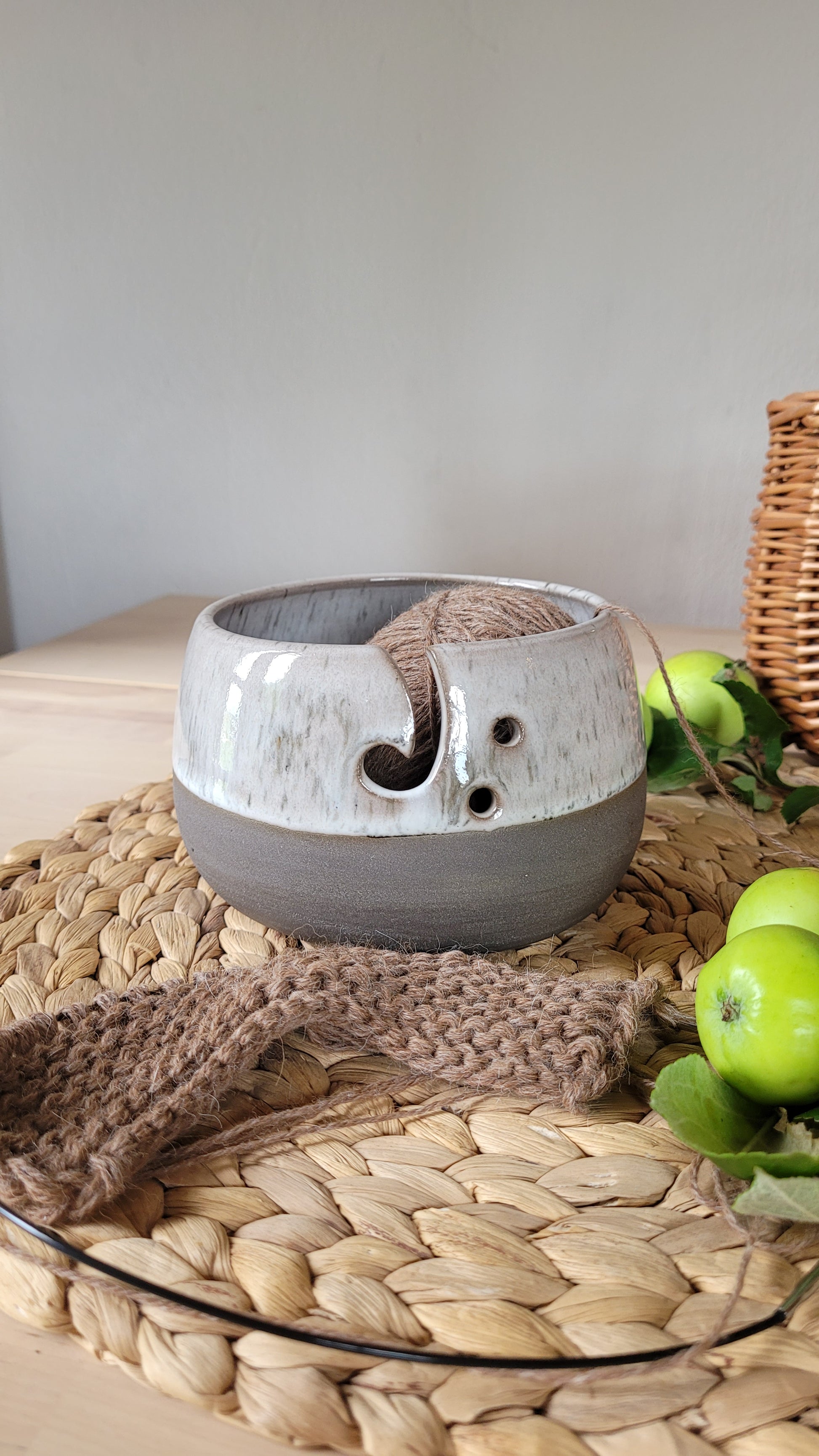 Introducing our exquisite Handmade Ceramic Yarn Bowl – a functional masterpiece that blends artistry and functionality. Crafted from durable stoneware, this yarn bowl features an attractive anthracite gray color on the outside, complemented by a smooth matte white glaze on the inside for effortless yarn gliding. The captivating beige white glaze with black speckles on the exterior adds a touch of elegance to your crafting space.