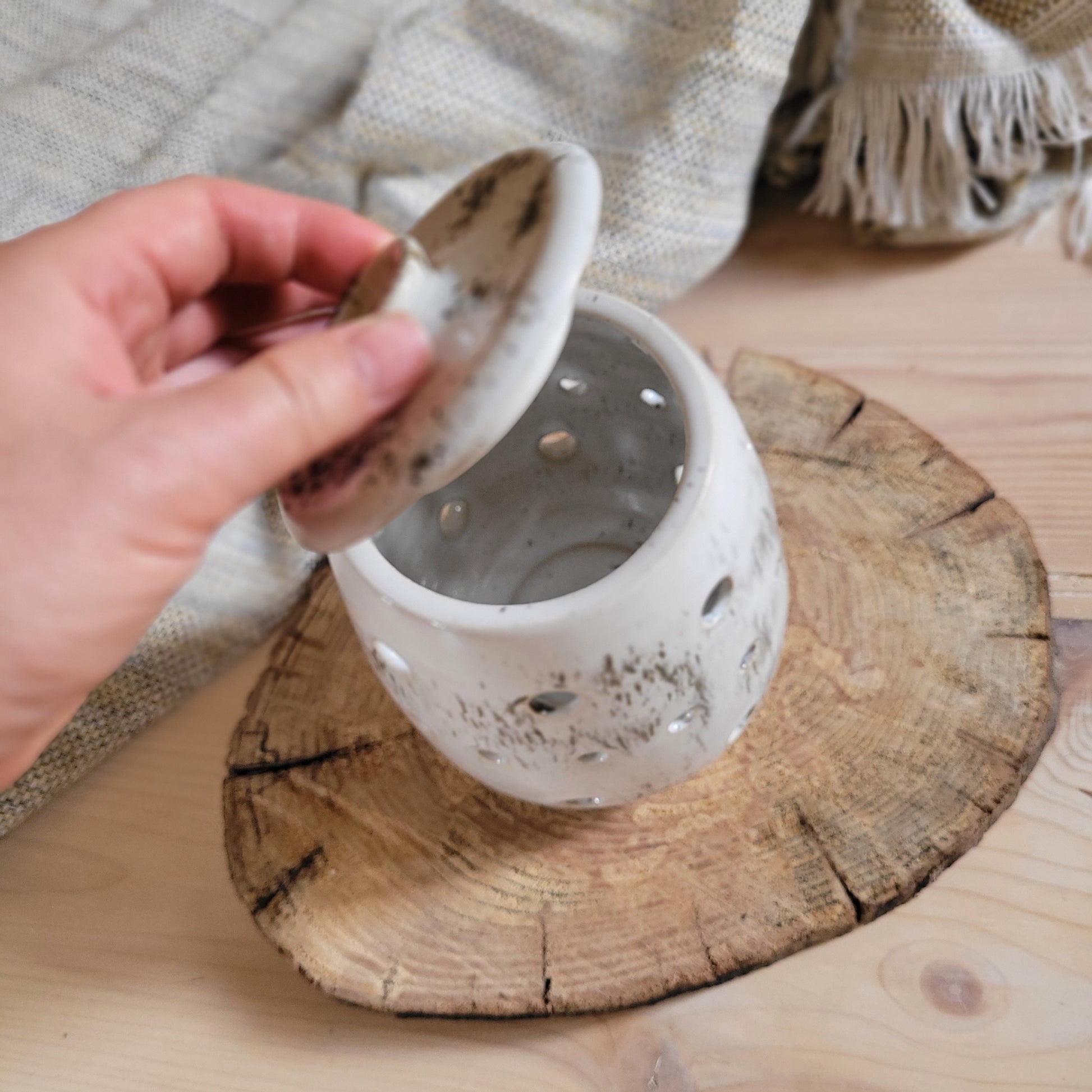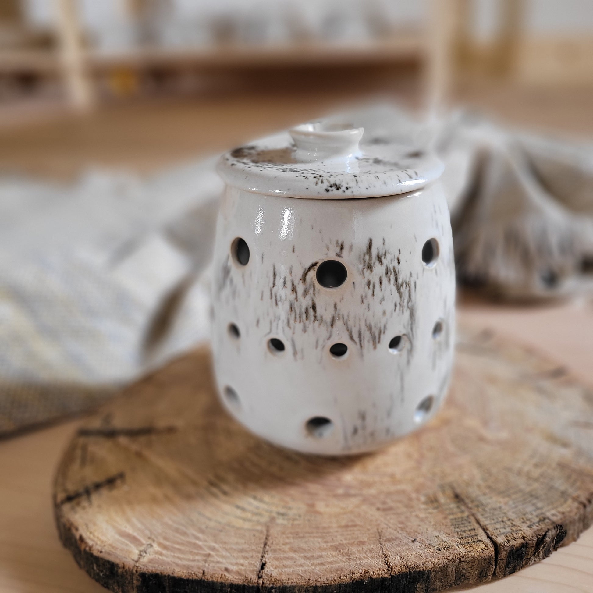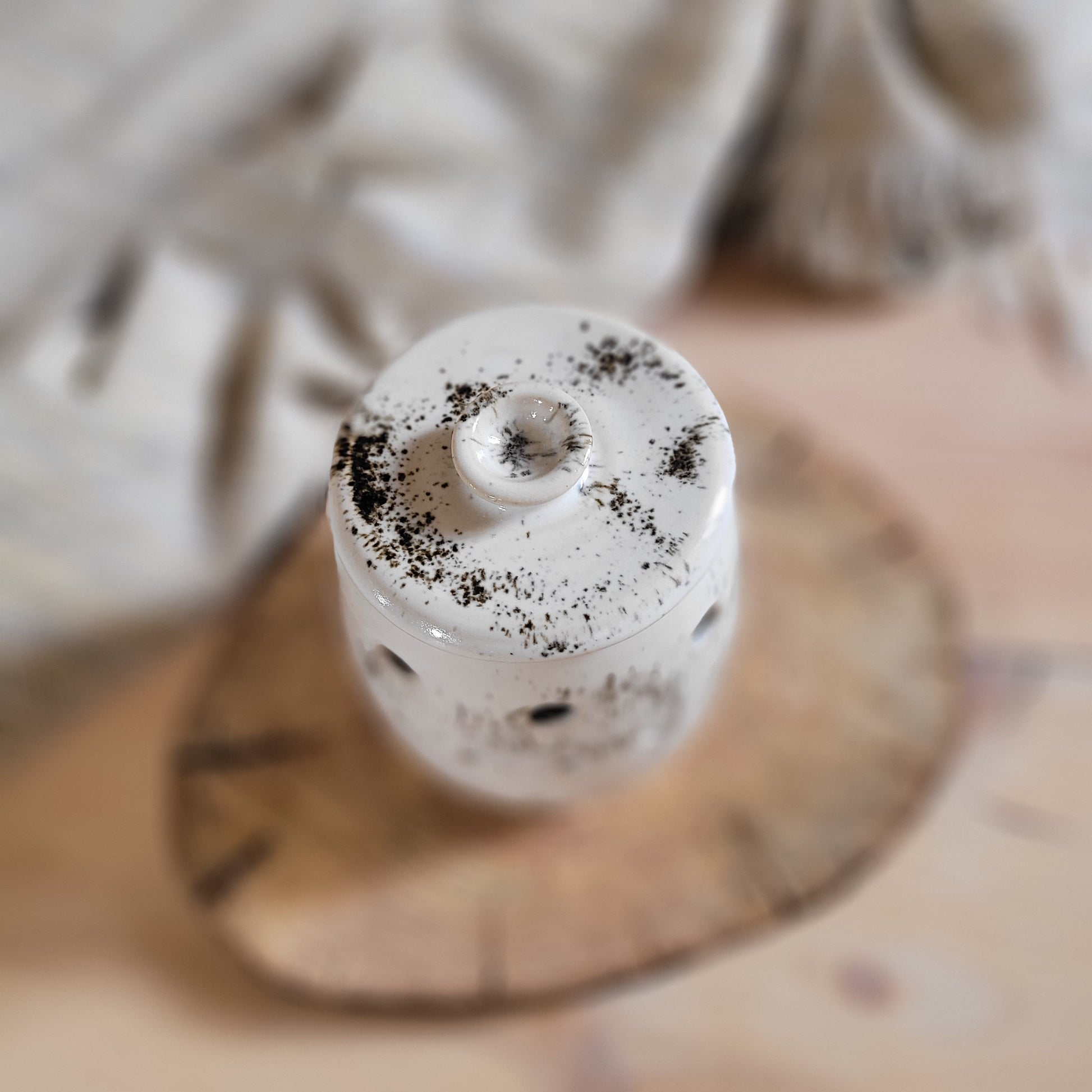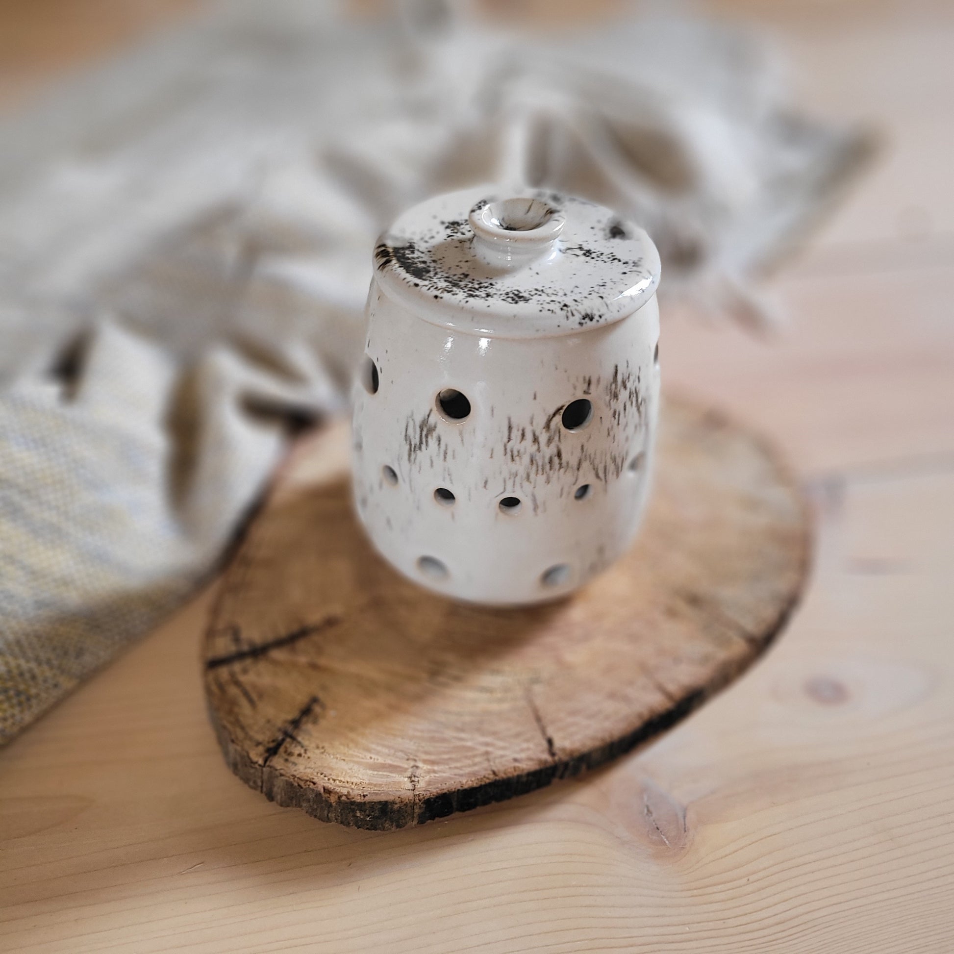 Keep your garlic fresh and flavorful with this charming handmade garlic pot. Crafted from white stoneware and finished with a beautiful white speckled glaze, it's both functional and stylish.