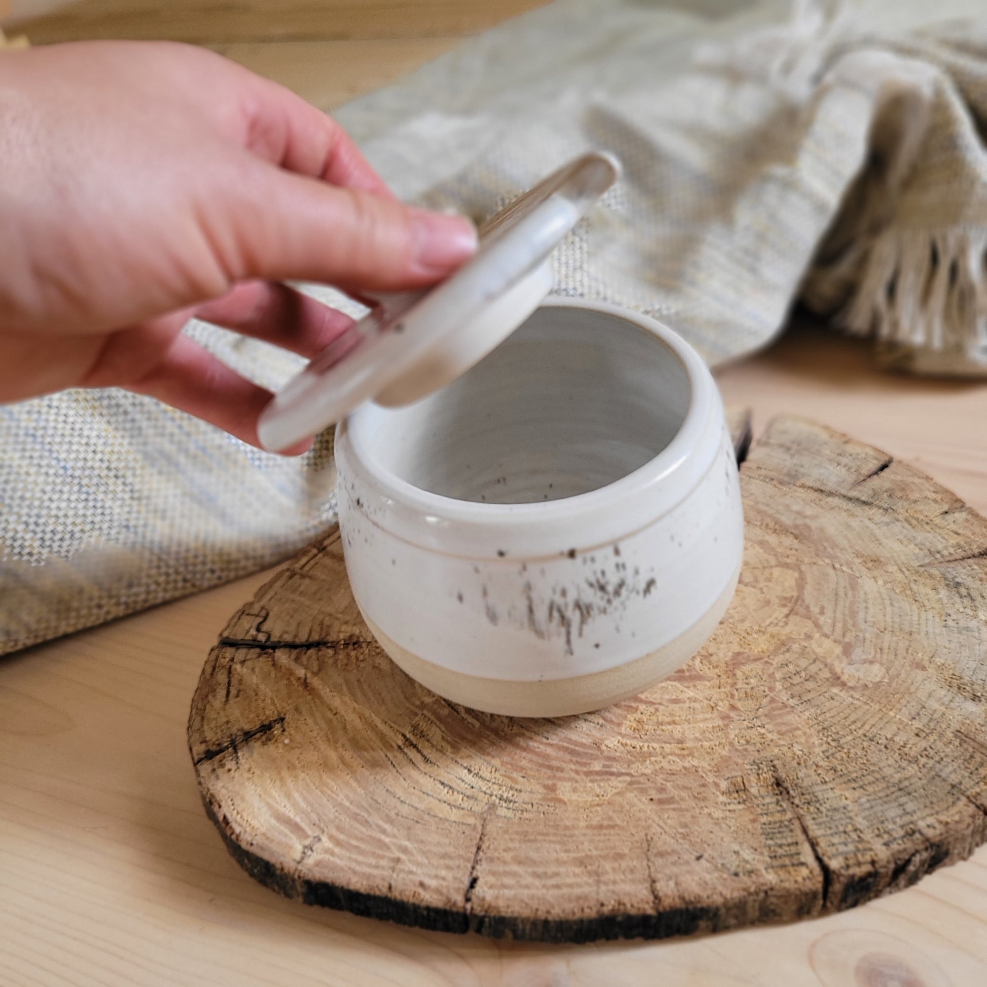 Handmade sugar jar, White stonaware with white speckled glaze.