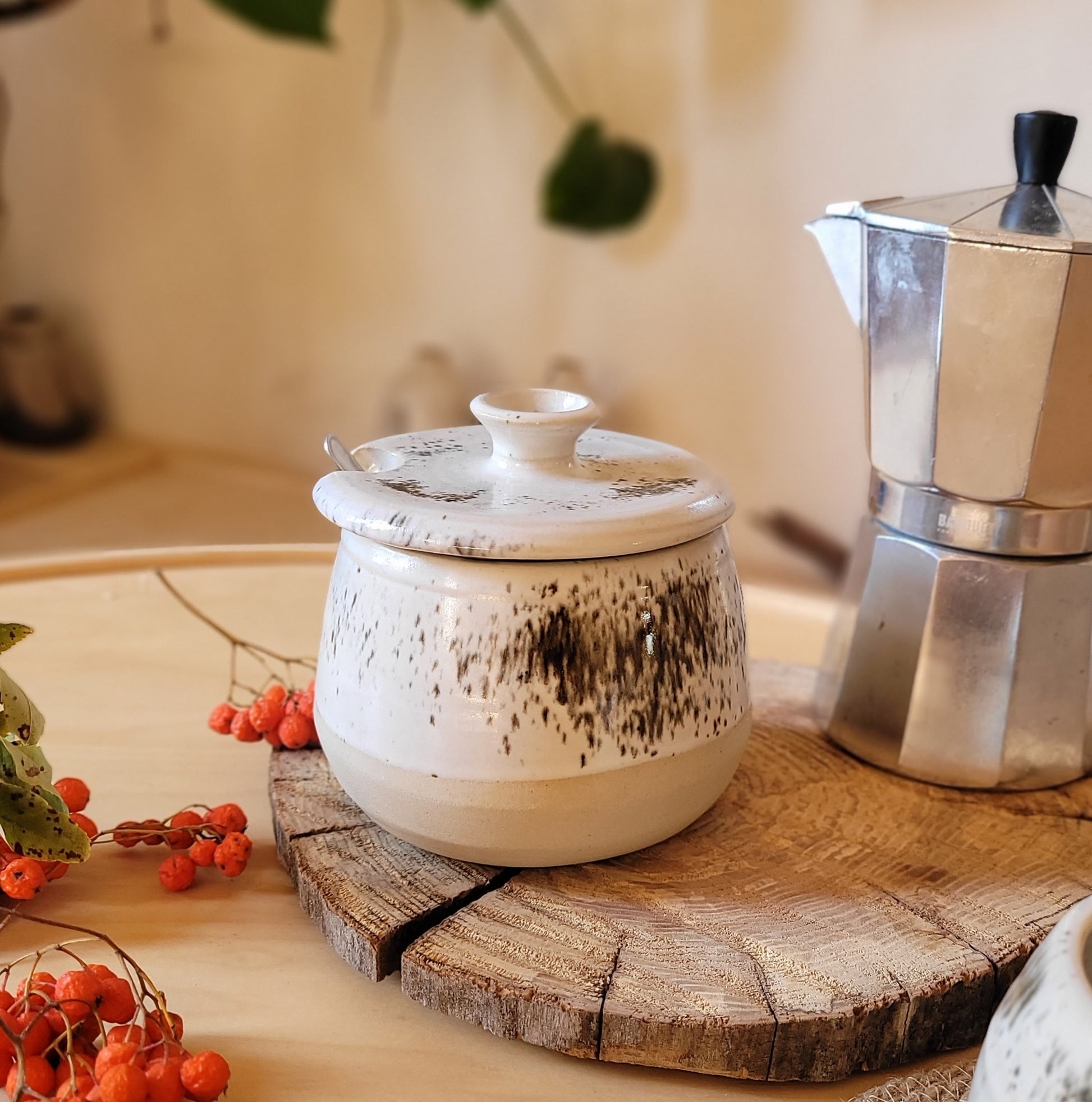 Add a touch of elegance to your kitchen with this charming handmade sugar jar. Crafted from white stoneware and finished with a beautiful white speckled glaze, it's both functional and stylish.